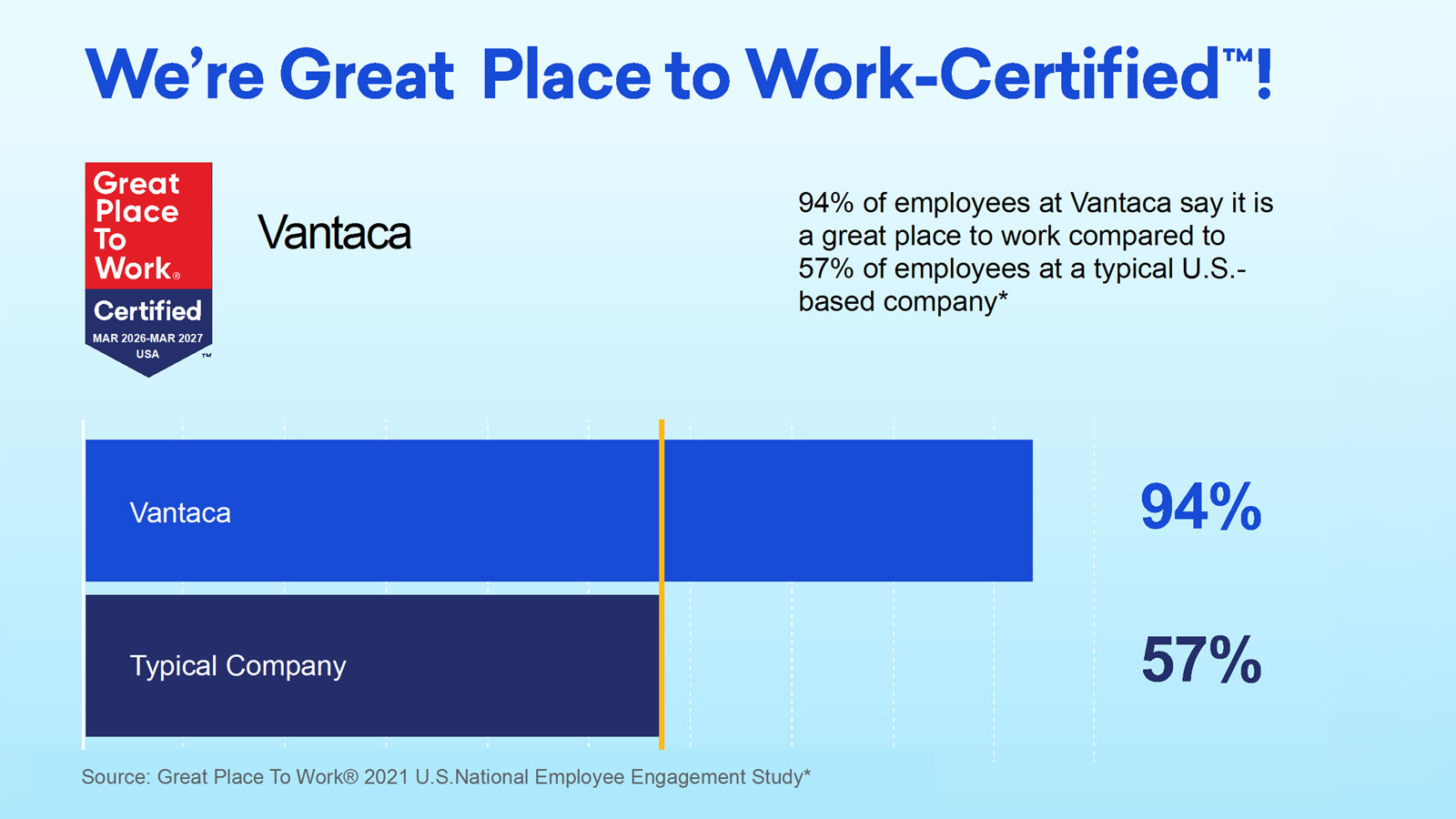 Vantaca is Great Place to Work® Certified as of 2026, based on survey results from its team members, administered by Great Place to Work.
